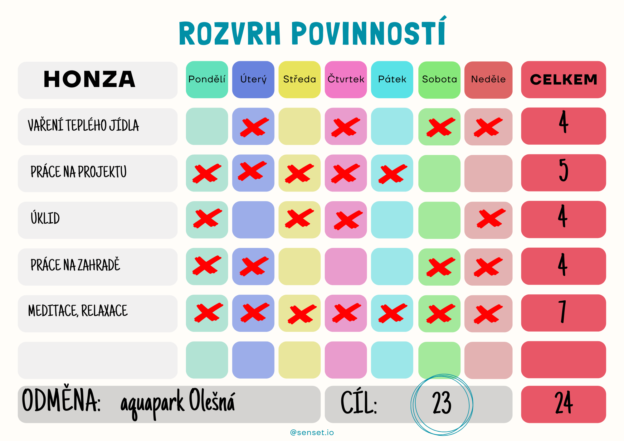 Praktická tabulka povinností je skvělým pomocníkem nejen pro děti, ale i dospělé! Rozvrh je ideální motivátor pro dosažení slíbené odměny. Tatínek Honza se domluvil se synem Kubou, že pojedou o víkendu do aquaparku, ale pouze pod podmínkou, že oba splní svůj týdenní cíl. A to se jim povedlo. Zkus to taky! Kubík je dokonce o bod lepší než taťka.